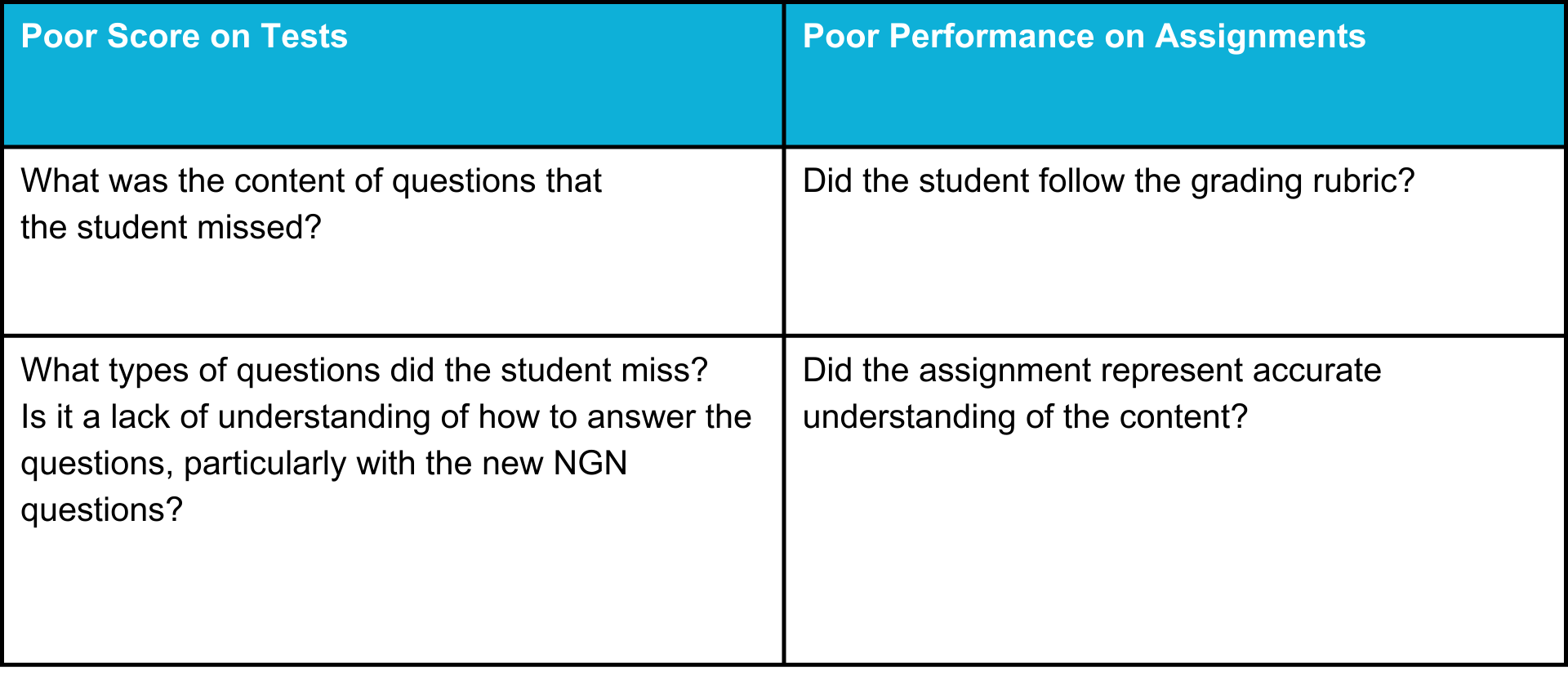 Regardless of the past academic experience, when students are admitted to nursing programs, many express a sense of culture shock. How often have you heard students say, “I have NEVER taken a test like this before!”? The breadth and depth of the content nursing students must absorb, the need to apply the content in a variety of different clinical experiences, and the stress associated with appropriate application of content to ensure the patient’s safety are all contributors to the anxiety that is a part of nursing school. Helping students on a one-to-one basis to address their weaknesses and build on their strengths in order to be safe practitioners is a prime responsibility for faculty. The six strategies above for supporting students through the remediation process can increase the likelihood of student success and have a lasting impact on student outcomes.